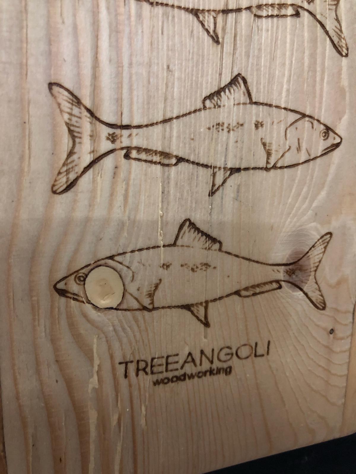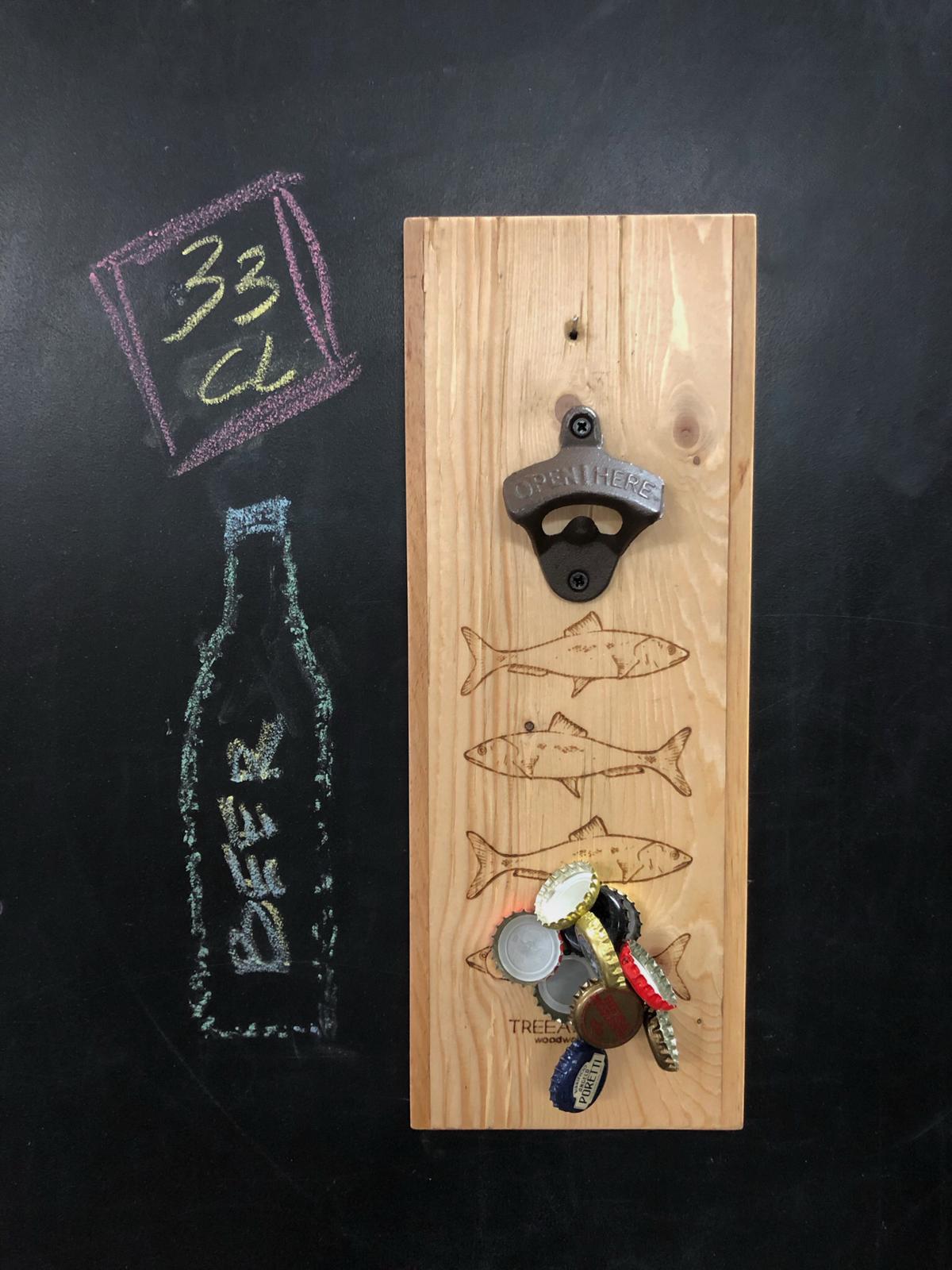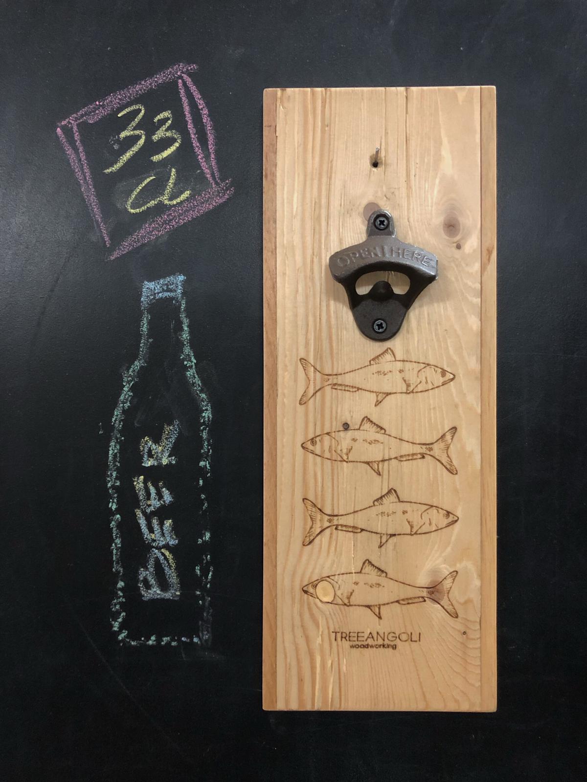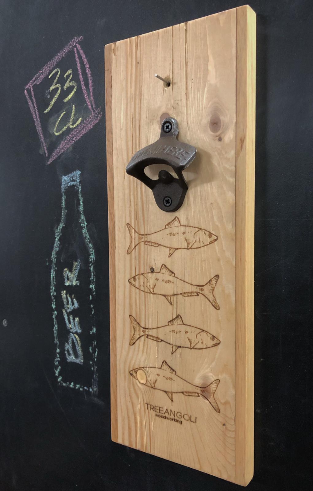 – Asse in abete – Listelli laterali in faggio e pioppo – Disegni e marchio stampati a laser – Cavatappi vintage in ghisa “open here” – Calamita a scomparsa per raccolta tappi