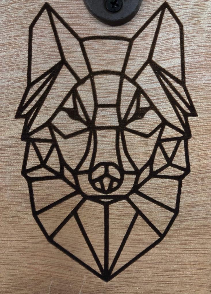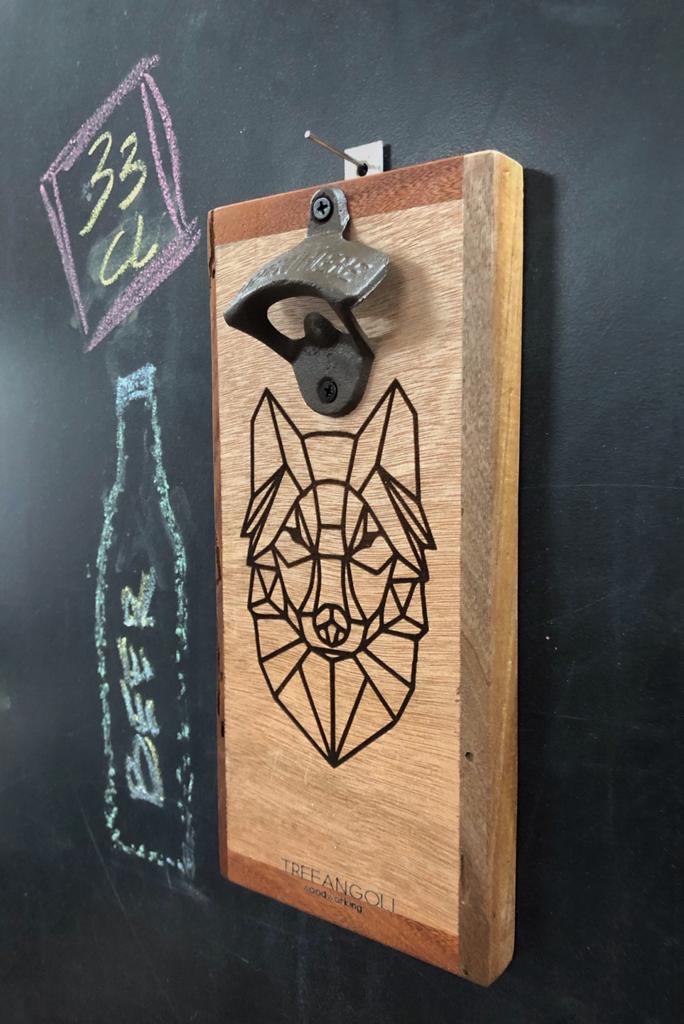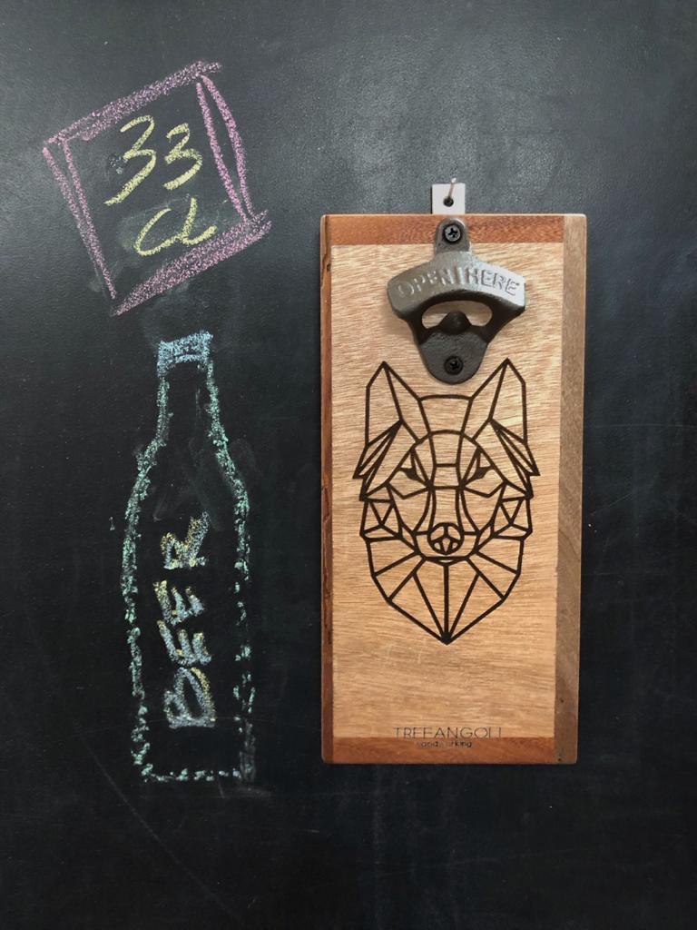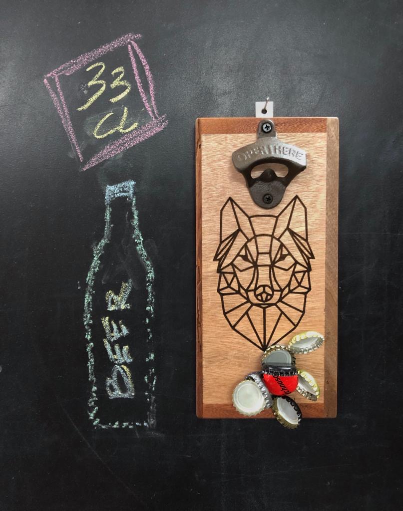– Asse in multistrato con cornice in mogano e noce – Disegno Lupo e marchio stampati a laser – Cavatappi vintage in ghisa “Open Here” – Calamita a scomparsa per raccolta tappi